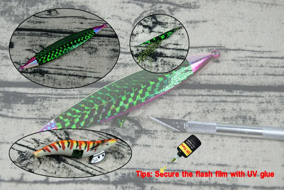 Tips: the film with adhesive, to secure it better on lures for flies, please cure it with clear glue or varnish.