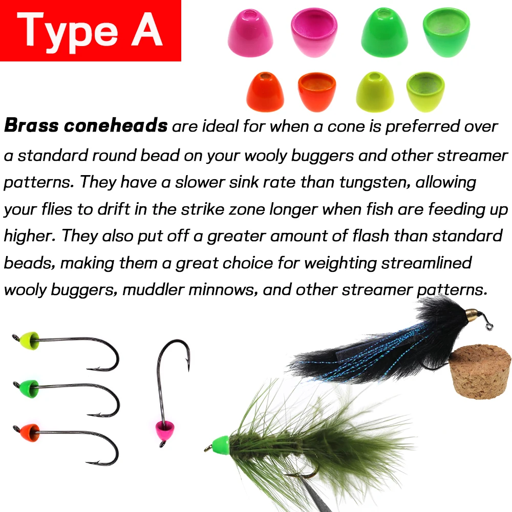 Brass coneheads are ideal for when a cone is preferred over a standard round bead on your wooly buggers and other streamer patterns. They have a slower sink rate than tungsten, allowing your flies to drift in the strike zone longer when fish are feeding up higher. They also put off a greater amount of flash than standard beads, making them a great choice for weighting streamlined wooly buggers, muddler minnows, and other streamer patterns.