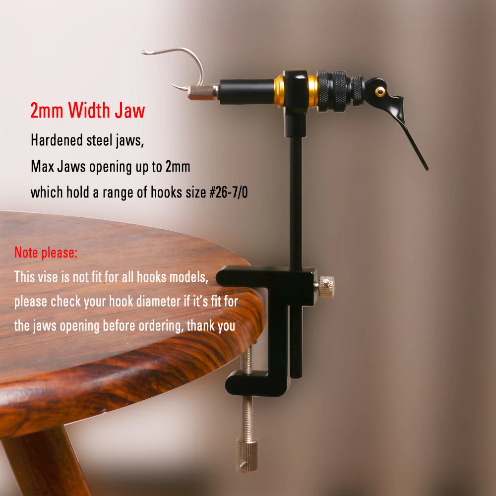 >>Fly tying vise with max jaw opening: 2mm,the jaw can hold hooks securely,The clamp fits for desk thickness: max. 40mm.